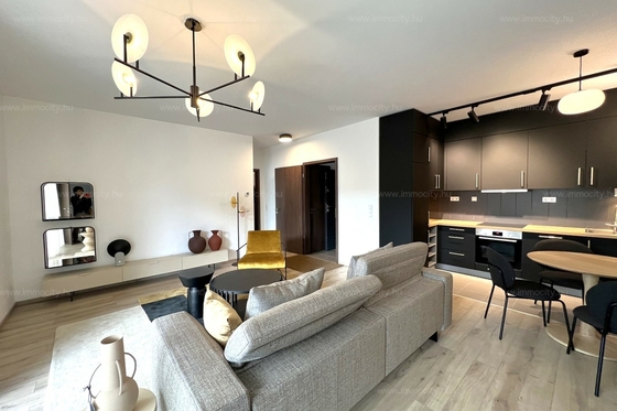 Az exkluzív, új bútorokkal berendezett lakásban mennyezeti hűtés-fűtés és padlófűtés van kiépítve.