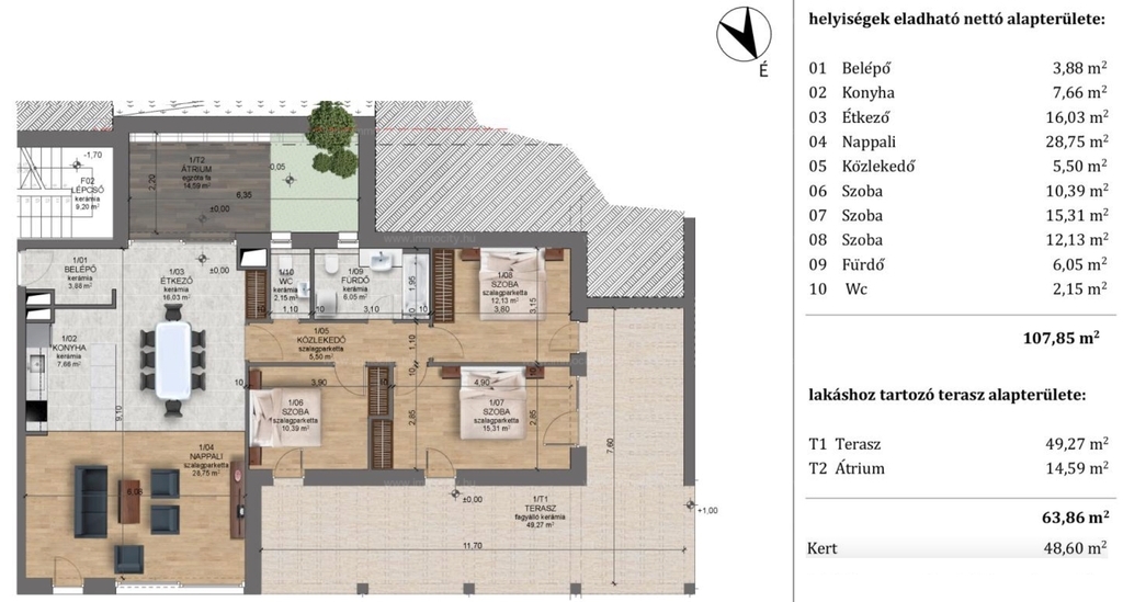 A földszinti 4 szobás lakás 107,85 m2 alapterületű, 49,27 m2-es terasszal, 14,59 m2-es átriummal és egy 48,60 m2-es kizárólagos használatú kertrésszel rendelkezik.