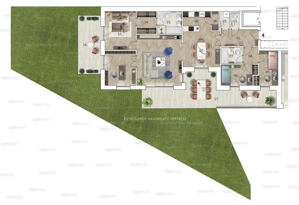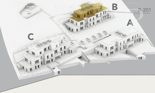 Az A épület földszinti, 5 szobás lakása 122 m2 alapterületű, 52,29 m2-es terasszal és 165 m2-es kizárólagos használatú kertrésszel rendelkezik.