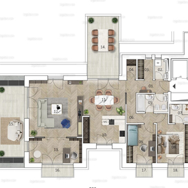 A C épület I. emeleti, 4 szobás lakása 113 m2 alapterületű, 42,70 m2-es terasszal és 50 m2-es kizárólagos használatú kertrésszel rendelkezik.
