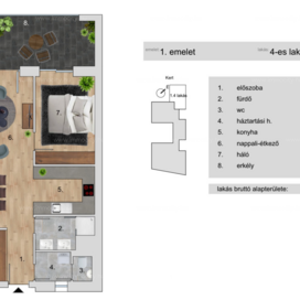 Az I.emeleti 2 szobás lakás 58,40 m2 alapterületű, 13,03 m2-es erkéllyel rendelkezik.