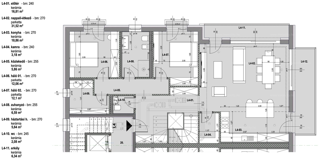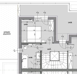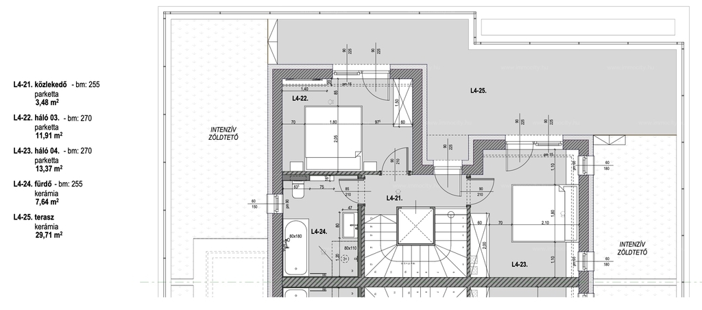 A belső kétszintes 5 szobás lakás 150 m2 alapterületű és összesen 46 m2 terasszal rendelkezik.