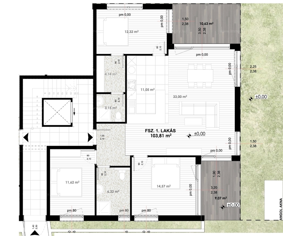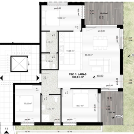 A földszinti 4 szobás lakás 101,67 m2 alapterületű, 25 m2-es terasszal és 80 m2-es kizárólagos használatú kertrésszel rendelkezik.