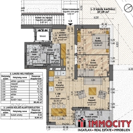 Az I. emeleti lakás 2+1 szobás, 82,99m2 alapterületű, 8,94m2-es erkéllyel és 37,59 m2-es kizárólagos használatú kertrésszel rendelkezik. A lakáshoz a P3 számú parkoló megvásárolandó a teremgarázsban 15 M Ft/hely vételáron, valamint a T05 jelű tárolóhelyiség 6 M Ft összegért.