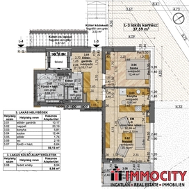 Az I. emeleti lakás 2 szobás, 60,99 m2 alapterületű, 8,94m2-es erkéllyel és 37,59 m2-es kizárólagos használatú kertrésszel rendelkezik. A lakáshoz a P3 számú parkoló megvásárolandó a teremgarázsban 15 M Ft/hely vételáron, valamint a T05 jelű tárolóhelyiség 6 M Ft összegért.