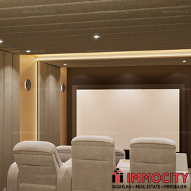 Földszint: 330 cm belmagasság, előtér, mosdó, zuhanyzó, gépesített konyhás nappali, 8 m2, 10 C hűtött kamra, 6 foteles, legmodernebb technikával ellátott multimédiás mozi szoba, 100 m2 terasz, infinity fűtött medence, 40 m2 Brustor üvegezett mozgatható lamellás fűtött pergola.