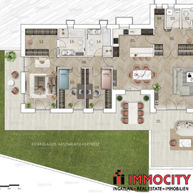 A C épület földszinti, 4 szobás lakása 140 m2 alapterületű, 79,11 m2-es terasszal és 140 m2-es kizárólagos használatú kertrésszel rendelkezik.